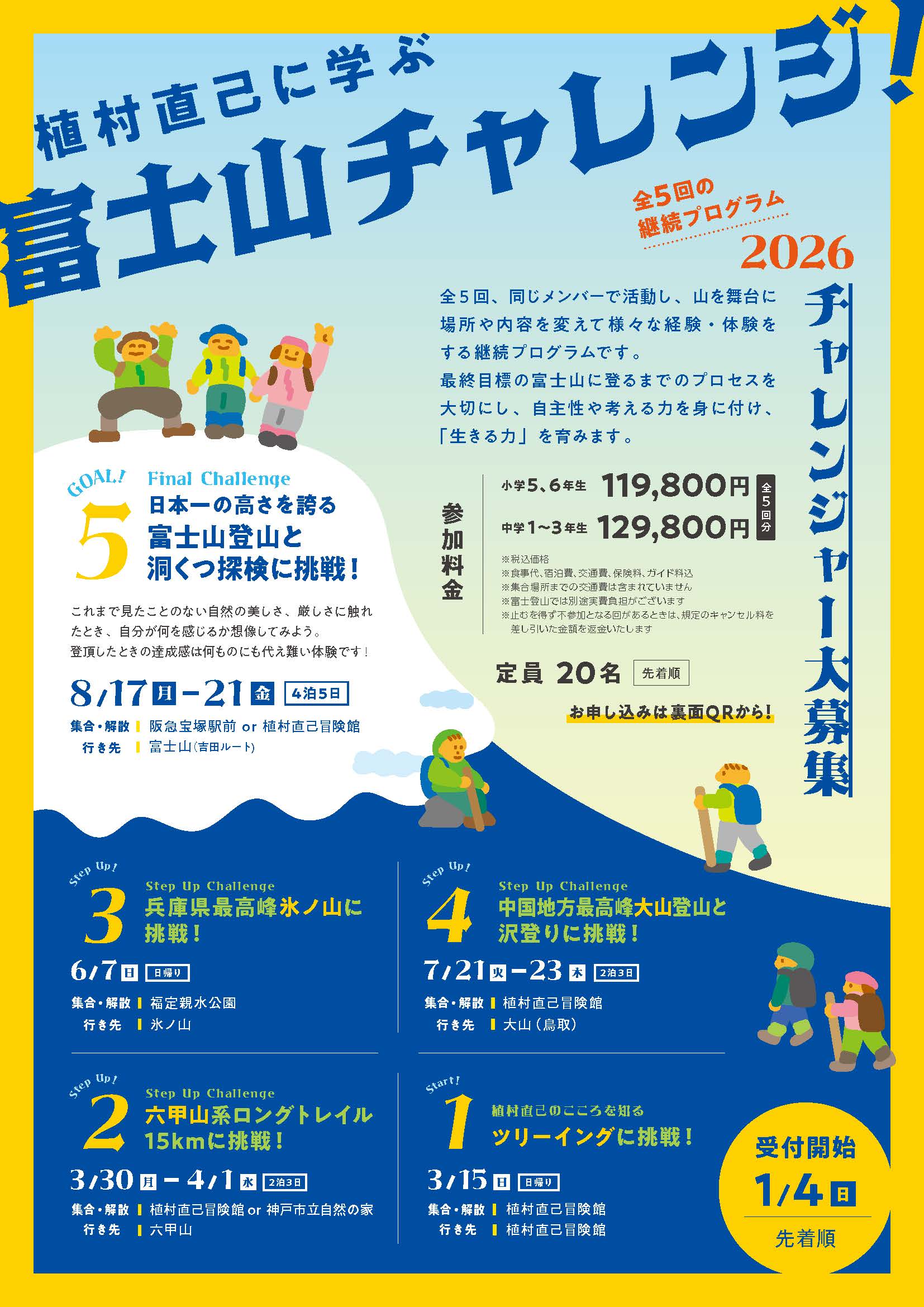 小学校5年生~中学3年生を対象に、富士山登頂を目指す年5回の登山プログラム。