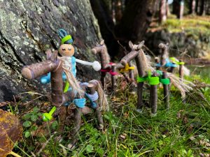 木の枝とどんぐり帽子を組み合わせれば、ぱっかぱっか木馬のできあがり。